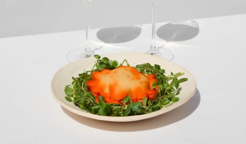 Crema de calabaza roja, mousse de leche ahumada